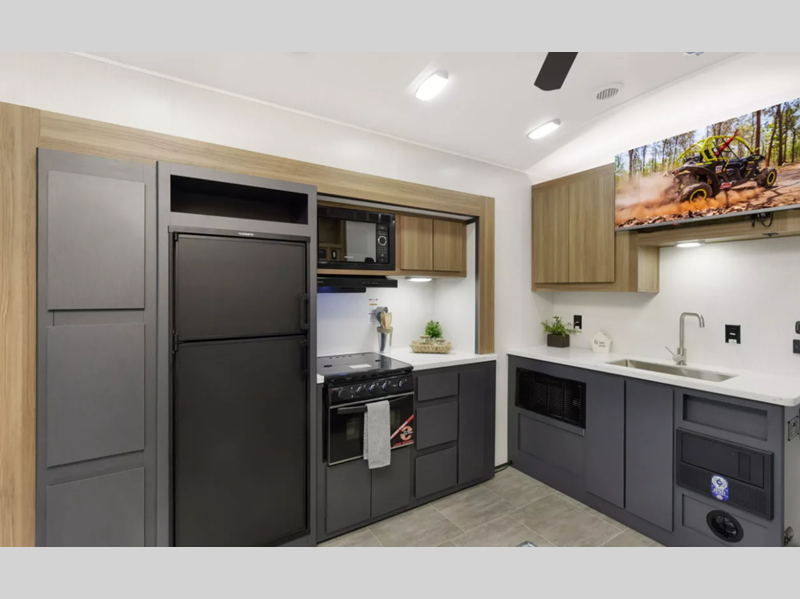 - Largest kitchen counter tops and storage than any toy hauler manufacturer
