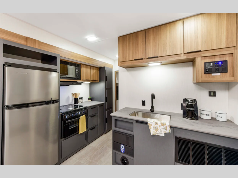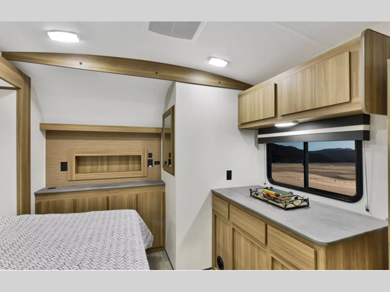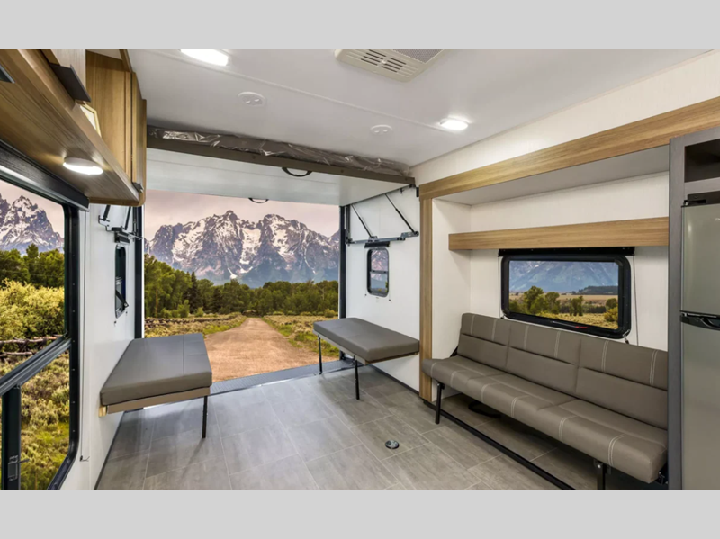Each model includes Azdel sidewall construction and a wide body design for your favorite ride-on toys. You will love the interior with its culinary kitchen workspace, residential furniture, carpet free slide outs, and pleated night shades. The Torque garage features fuel and oil resistant diamond plate TPO rubberized flooring, a high efficiency 12V fan, and a rear screen for maximum ventilation.